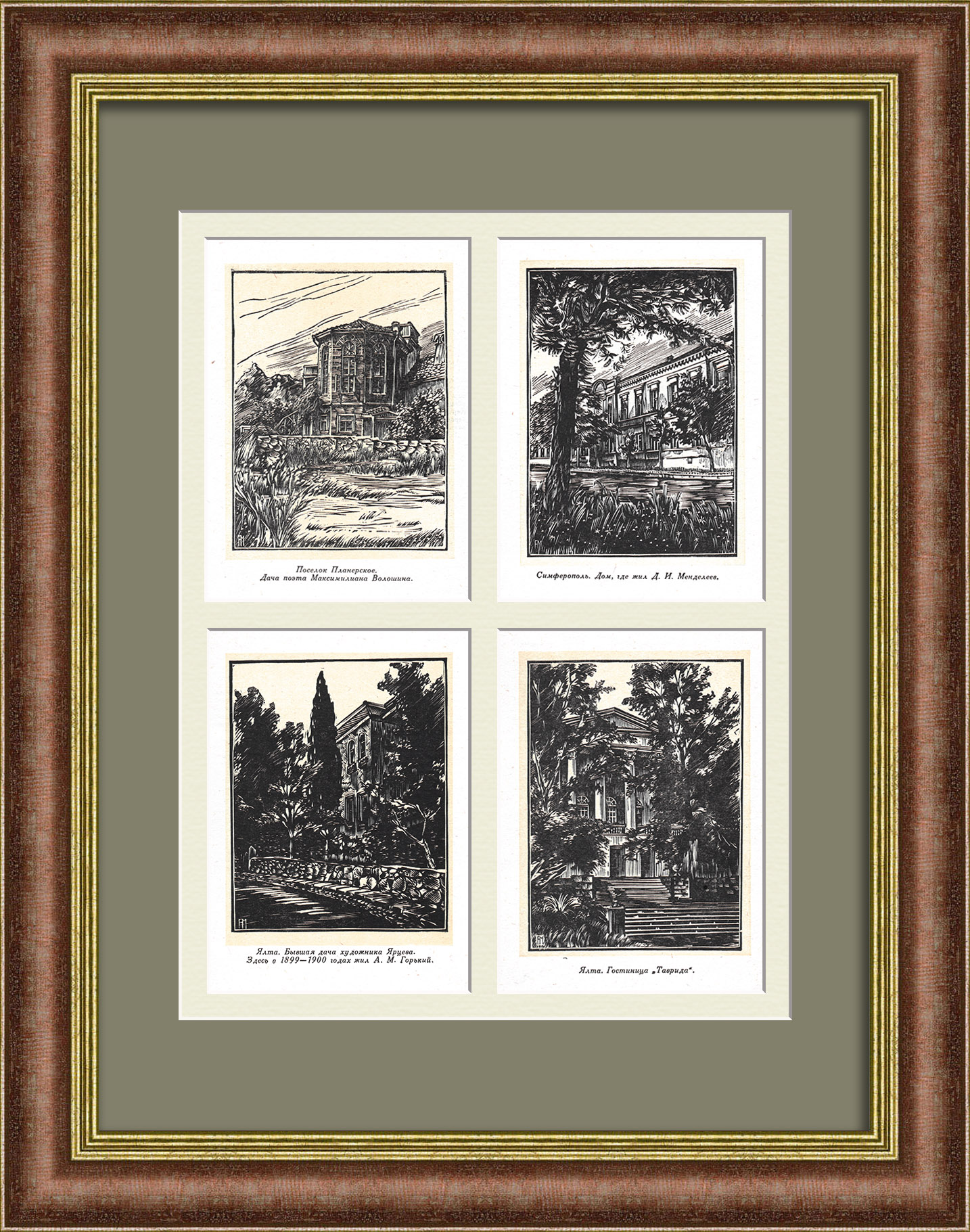 Экспрессивное панно с антикварными гравюрами в технике ксилографии эпохи «оттепели» представляют собой серию изображений с архитектурными видами Крыма, который с конца XVIII в. стал частью Российской империи. В конце XIX-начале XX вв. на полуострове возводится множество особняков – дач богатых промышленников, представителей аристократии, интеллигенции, а также гостиниц, так как Крым уже тогда обретает важное туристическое значение, а его климат благотворно влияет на здоровье приезжих. В панно [по часовой стрелке] представленные следующие виды Крыма: