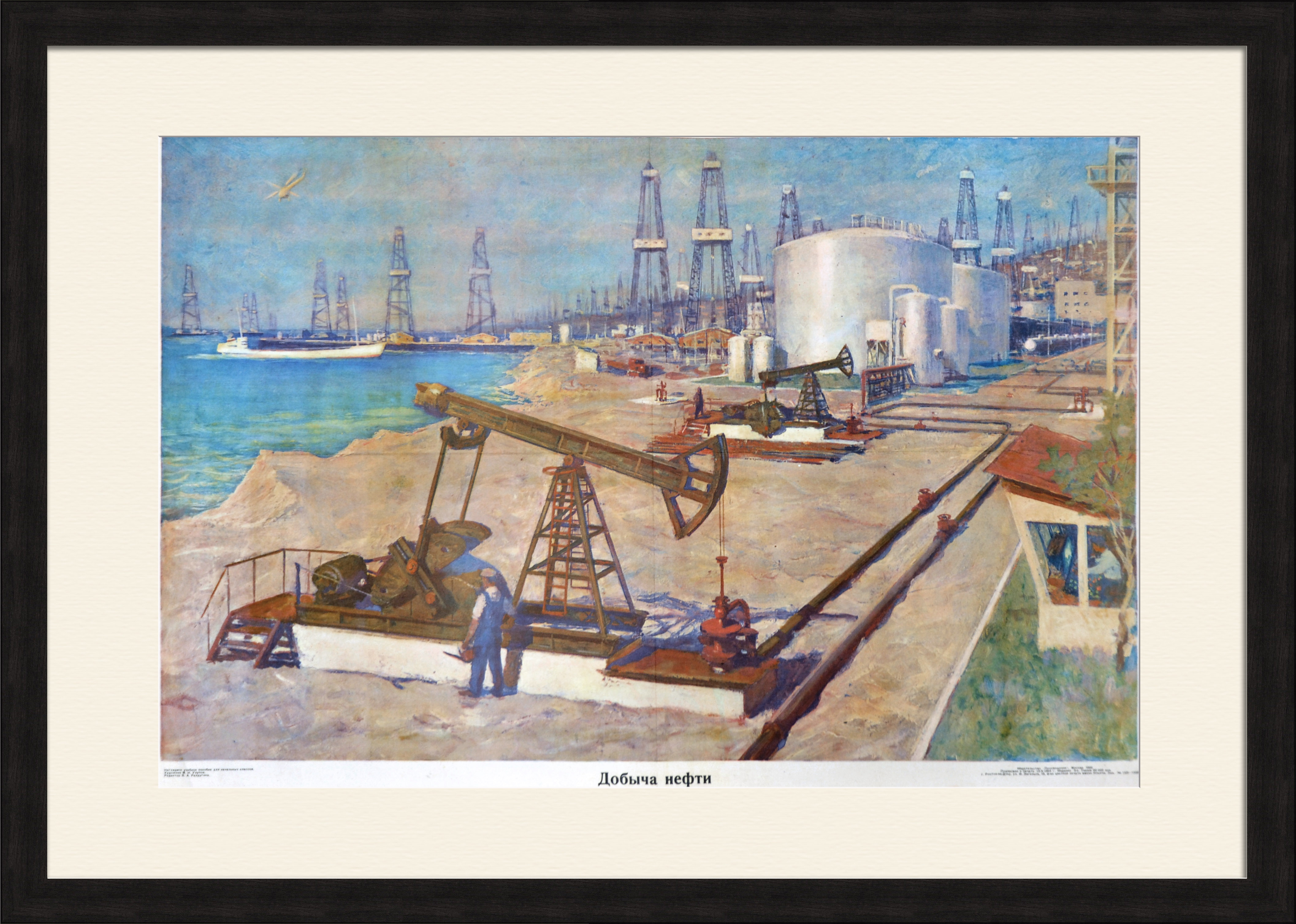 Редкий, крупноформатный, выразительный плакат, выполненный по картине советского художника М.И. Улупова «Добыча нефти», представляет собой общий вид нефтяного месторождения, которое обустроено не только на суше, но и на море. Первые опыты бурения на море начались еще в царской России, благодаря изобретенной методике Л.К. Згленицкого. Уже в советское время в 1930-х гг. вблизи острова Артема на Каспийском море были сооружены металлические платформы для бурения скважин, а в 1949 г. на Каспии была пробурена первая нефтяная скважина в открытом море. Время выпуска плаката относится началу VIII пятилетки (1966-1970 гг.), когда руководство Советского Союза продолжало делать значительные капвложения в развитие нефтедобывающей отрасли с целью увеличения показателей и решения топливного вопроса. Так, в 1965 г. было добыто 243 млн тонн нефти. Разведка морских и прибрежных нефтяных месторождений по-прежнему занимала важное место в развитии тяжелой промышленности: «В связи с этим особо следует остановиться на развитии добычи нефти и газа на полуострове Мангышлак, где намечается создать новый крупный район нефтедобычи и довести ее к концу пятилетки в целом по Казахстану до 15 миллионов тонн. Это совершенно правильно. Но надо иметь в виду, что запасы нефти на Мангышлаке определяются многими сотнями миллионов тонн, а совсем недавно нашими геологами выявлено, что здесь кроме нефти имеются огромные запасы природного газа, исчисляемые, по предварительным данным, в сотнях миллиардов кубометров.» [Речь первого секретаря ЦК партии Казахской ССР Кунаева Д.А. на XXIII Съезде ЦК КПСС]».