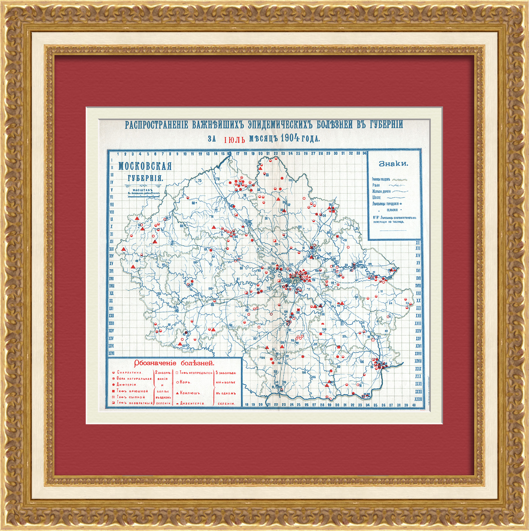 Уникальная, дореволюционная карта «Распространение важнейших эпидемических болезней в губернии за июль 1904 года» демонстрирует уровень заболеваемости такими болезнями, как скарлатина, оспа натуральная, дифтерия, тиф брюшной, сыпной и возвратный, тиф неопределенный, корь, коклюш и дизентерия в Московской губернии. К моменту публикации этой карты прошел не один век, за который сфера народного здоровья претерпела изменения в сторону более интенсивного развития. Так, указанные выше заболевания были одними из самых распространенных в XIX-начале XX вв. Основанное в 1802 г. Министерство внутренних дел, в составе которого находилась Медицинская коллегия (позднее Медицинский департамент), активно занималось сбором и публикацией данных об уровне заболеваемости населения. Медицинский департамент управлял губернскими врачебными управами, организовывал противоэпидемиологические мероприятия, занимался подготовкой медицинских кадров, поставкой лекарств в учреждения здравоохранения, содействовал развитию аптечного дела, занимался судебной медицинской экспертизой [Мельник Е.В. Противоэпидемиологические административно-правовые меры в дореволюционной России]. Также получили распространение карантинные уставы и на законодательном уровне закреплялась необходимость прививать детей. На графическом листе красным обозначено распространение разных заболеваний - «2 заболевания и более в одном селении», а также «5 заболеваний и более в одном селении». В верхней части синим представлены обозначения границ уездов, реки, железные дороги, шоссе, наконец, лечебницы.
