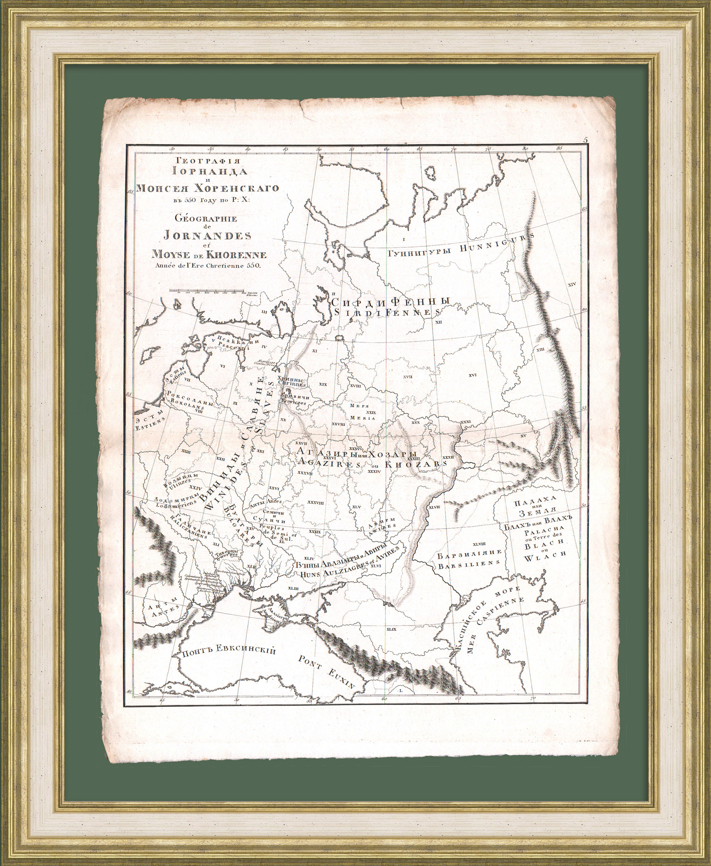 Крупноформатная гравированная карта была выполнена по историко-географическим трактатам историка Иордана (Иорнанда) «О происхождении и деянии гетов» или «Гетика» VI в. и «Армянской географии» VII в., приписываемой Моисею Хоренскому. На графическом листе представлена территория от Белого моря и Архангельска на севере до Черного (Понт Евксинский) и Каспийского (Хвалынское море) морей на юге, от Пруссии на западе до Оренбургской губернии на востоке. Особенностью данной карты является использование исторических названий племен, относящихся не только к разным ветвям славянства (виниды и славяне, роксоланы, кривичи и др.), но и тюркских народов (например, азары или хозары), которые отмечены на карте в соответствии с местами их расселения. Гравированная карта являлась частью «Археологического атласа Европейской России» 1823 г.: «К числу таковых трудов относится издание сего Исторического Атласа Древней России, составленного из древних Историков и Географов, повествовавших о ней или живших на пространстве ея, народах.».