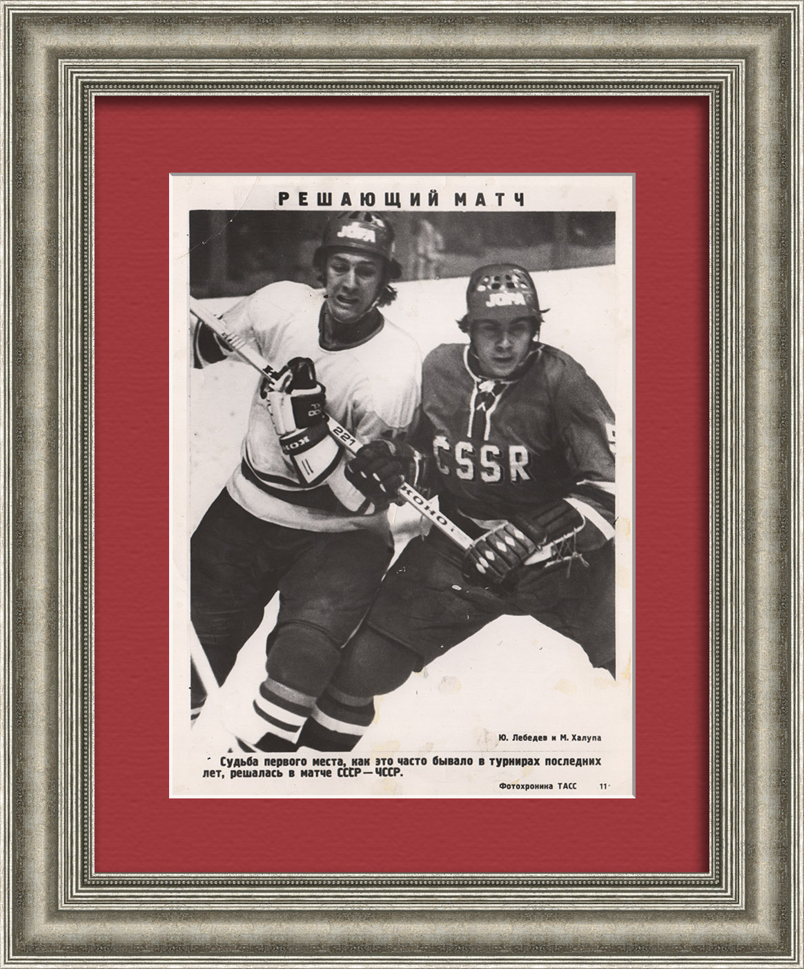 Советская историческая фотография документирует один из хоккейных матчей между СССР и Чехословакией за первое место. На графическом листе представлены два титулованных спортсмена - Ю. Лебедев (СССР) и М. Халупа (ЧССР). Ю.В. Лебедев, игравший большую часть своей спортивной карьеры (13 сезонов, до 1985 г.) за московские «Крылья Советов» стал самым титулованным спортсменом в истории этого клуба, благодаря профессиональной игре которого «Крылья Советов» получили золото в Чемпионате СССР в 1974 г. На его счету также шесть побед в Чемпионатах мира, серебряная медаль Олимпиады 1980 г. и многие другие награды. На фотографии показан момент борьбы Ю.В. Лебедева с чешским защитником Миланом Халупой - чемпионом мира 1976 г., 1977 г., серебряным призером Олимпийских игр 1976 г. и 1984 г. Завершает композицию комментарий к фото: «Судьба первого места, как часто бывало в турнирах последних лет, решалась в матче СССР - ЧССР.».