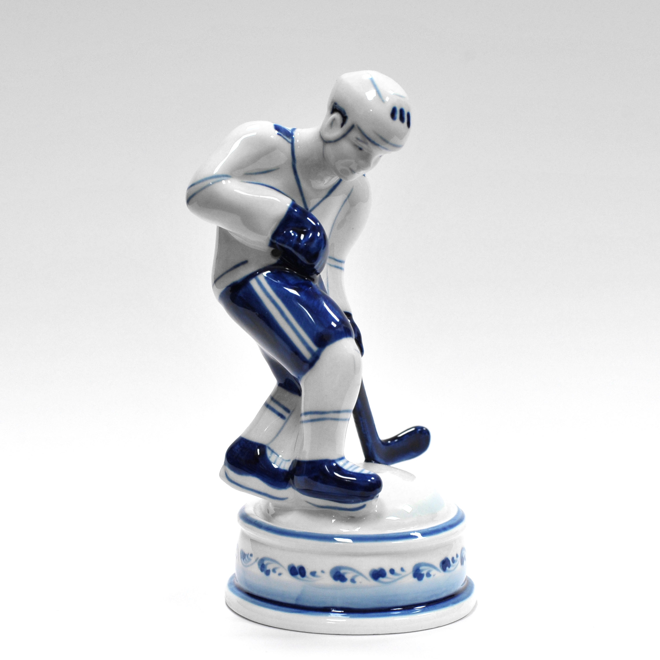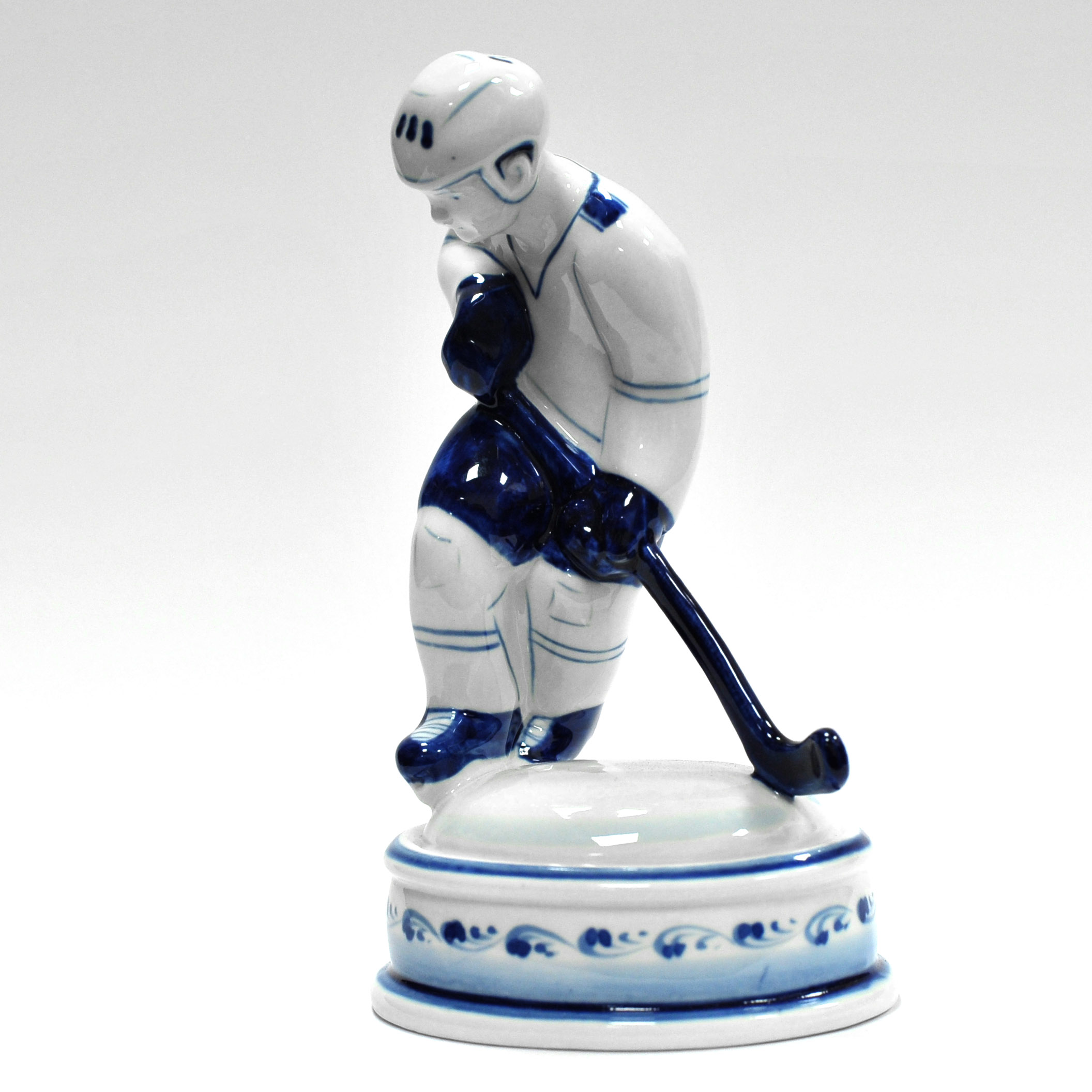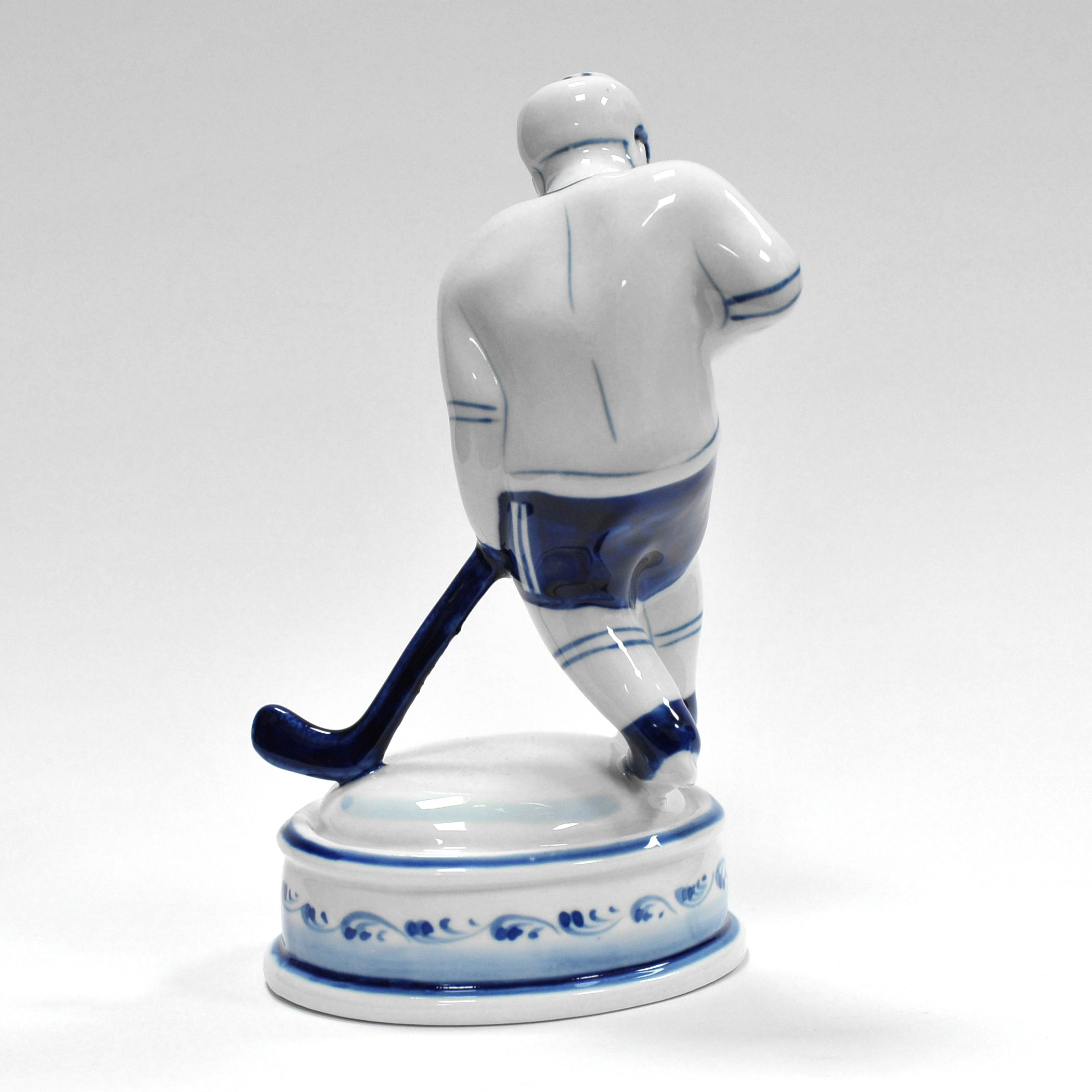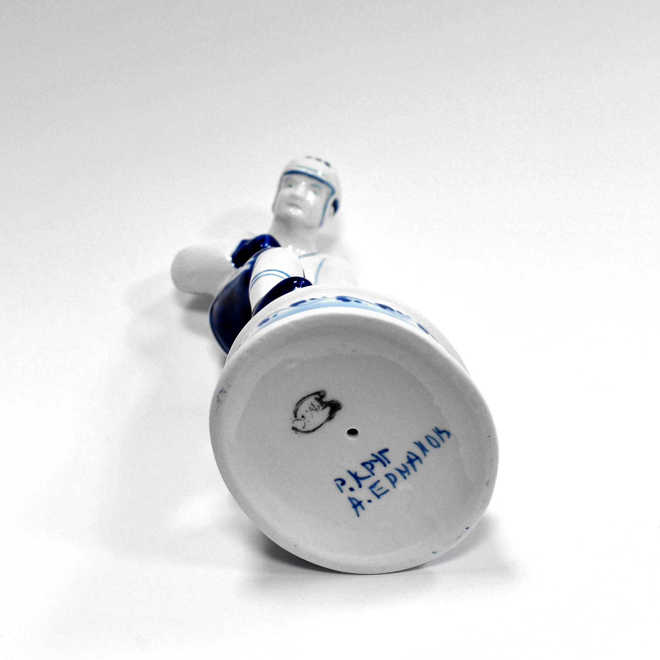 Выразительная, фарфоровая статуэтка, произведенная по специальному заказу галереи, представляет собой единение многовековой художественной традиции Гжели с современным спортивным мотивом - хоккеем. Гжельский промысел ведет свою историю с 1318 г., когда территории с развитым производством керамики были присоединены к укрепляющему свои позиции Московскому княжеству. Само понятие Гжель впервые встречается завещании князя Ивана Калиты в 1339 г., который завещал своему сыну керамические мастерские. На протяжении многих веков гжельские керамические и фарфоровые мастерские являлись и продолжают являться отражением высокого качества изделий. Так, во второй половине XVII в. при царе Алексее Михайловиче - это эксклюзивный поставщик аптекарских и алхимических сосудов для Аптекарского приказа, а при Петре I Гжель под влиянием голландской моды, а именно сине-белых дельфтских изразцов, создаются изделия гжельскими мастерами (формально сине-белый орнамент относится в начале XIX в.). Первый крупный фарфоровый завод в Гжели был основан Я.В. Кузнецовым и сыновьями в 1810 г. и производил большое количество разнообразных фарфоровых и керамических изделий, однако с приходом к власти Советов фокус производства сместился на промышленную продукцию - электроизоляторный фарфор. Лишь в 1930-1940-е гг. советскими фарфористами были постепенно восстановлены древние технологии создания изделий фарфора, фаянса, майолики. Представленная статуэтка в виде динамичной фигуры хоккеиста демонстрирует мастерство тончайшей росписи, а также скульптурной лепки мастеров Гжели. Форма постамента, украшенная историческим гжельским орнаментом, напоминает хоккейную шайбу, что также раскрывает авторский замысел. На дне статуэтки - клеймо и фамилия художника по росписи, а также автора формы.