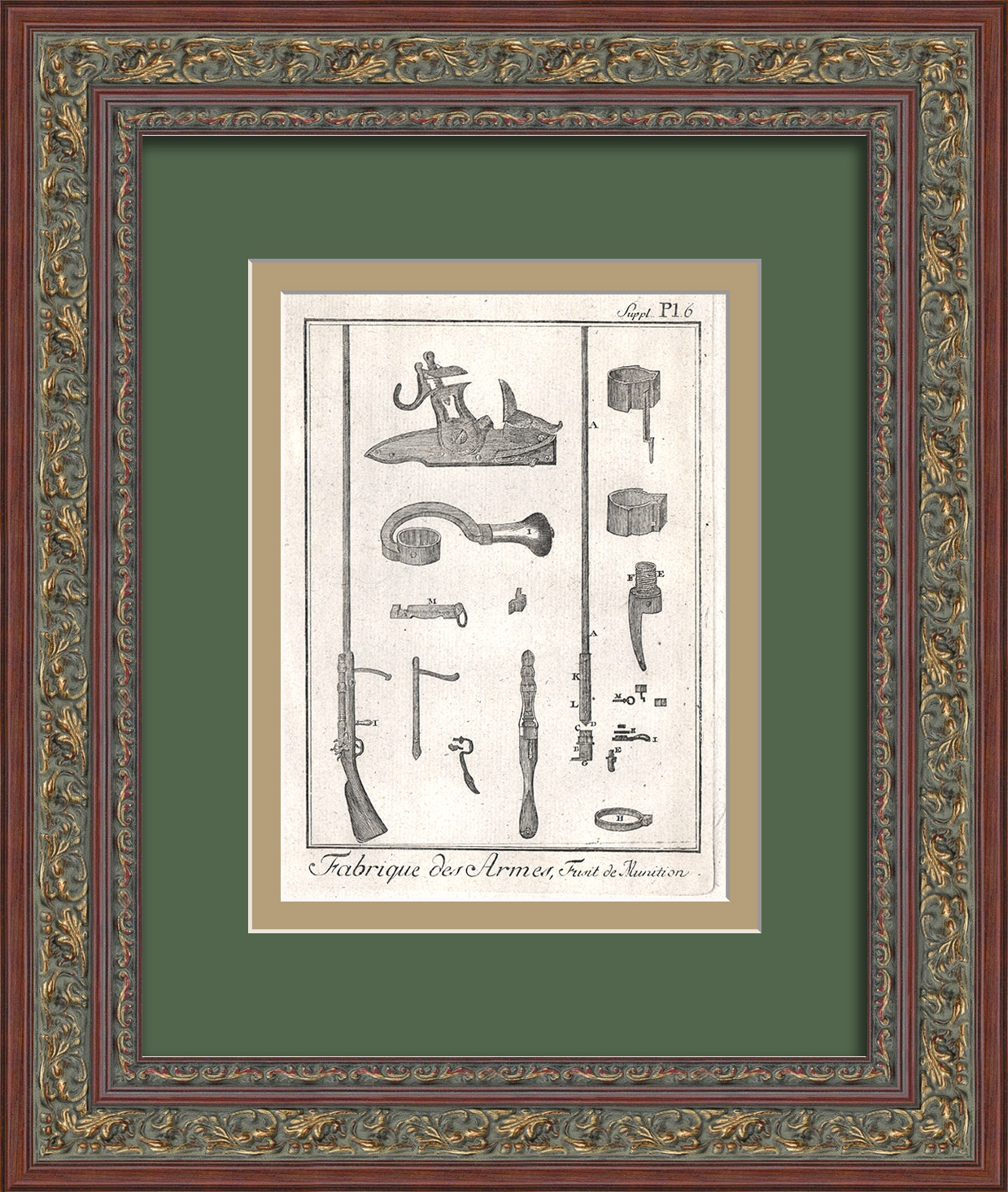 Уникальная, коллекционная гравюра на меди эпохи Просвещения с оригинальным названием «Fabrique des Armes, fusil de Munition» / «Производство оружия, мушкет с боеприпасами» демонстрирует высокий уровень военного оснащения в то время. Эпоха Просвещения помимо подъема научной и философской мысли также характеризуется постоянным пребыванием Европы и Северной Америки в военном положении, что требовало активной, непрерывной модернизации военного оружия, тактик ведения боя. В Словаре Д. Дидро присутствуют около 1250 статей на темы производства оружия, фортификации, артиллерии, тактики и стратегии, что свидетельствует о высоком спросе на практическую информацию о военном искусстве.