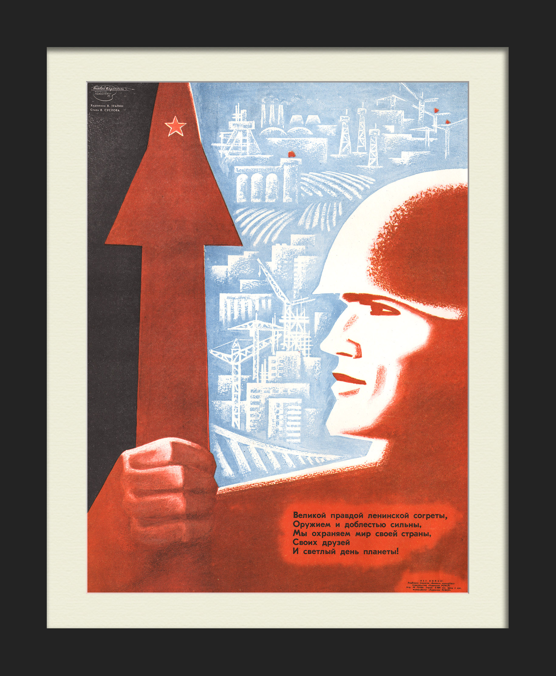 Советский, агитационный малотиражный плакат посвящен роли значимой Советской Армии в сохранении мира не только своей страны, но и в мире в связи с продолжительной холодной войной с США. Время создания графического листа соотносится с моментом, когда Вооруженные Силы Советского Союза были крупнейшими в мире по численности (к 1989 г. – 5.350.800 военных). Несмотря на стремление СССР к международной разрядке, угроза со стороны империалистических государств сохранялось, что требовало высококвалифицированной подготовки военных и эффективной военной техники. Так, на XXVII Съезде ЦК КПСС в 1986 г. было отмечено: «Учитывая сложную международную обстановку, растущую агрессивность реакционных империалистических кругов, Центральный Комитет КПСС, Политбюро ЦК уделяют неослабное внимание обороноспособности страны, боевой мощи Вооруженных Сил СССР, укреплению воинской дисциплины. Советская Армия и Военно-Морской Флот располагают современным вооружением и техникой, имеют хорошо обученный личный состав, подготовленные, беззаветно преданные народу командные и политические кадры. Они достойно выполняют свой долг в самой сложной, порою суровой обстановке. Со всей ответственностью мы можем сегодня заявить: оборонное могущество СССР поддерживается на таком уровне, который позволяет надежно защищать мирный труд, мирную жизнь советских людей.». На графическом листе представлен собирательный образ советского солдата, который словно богатырь держит копье, напоминающее ракету, что раскрывает силу СССР как ядерной державы. На фоне показан мирный строящийся, развивающийся город, который охраняют русские воины. Завершает идейный замысел плаката стихотворение: