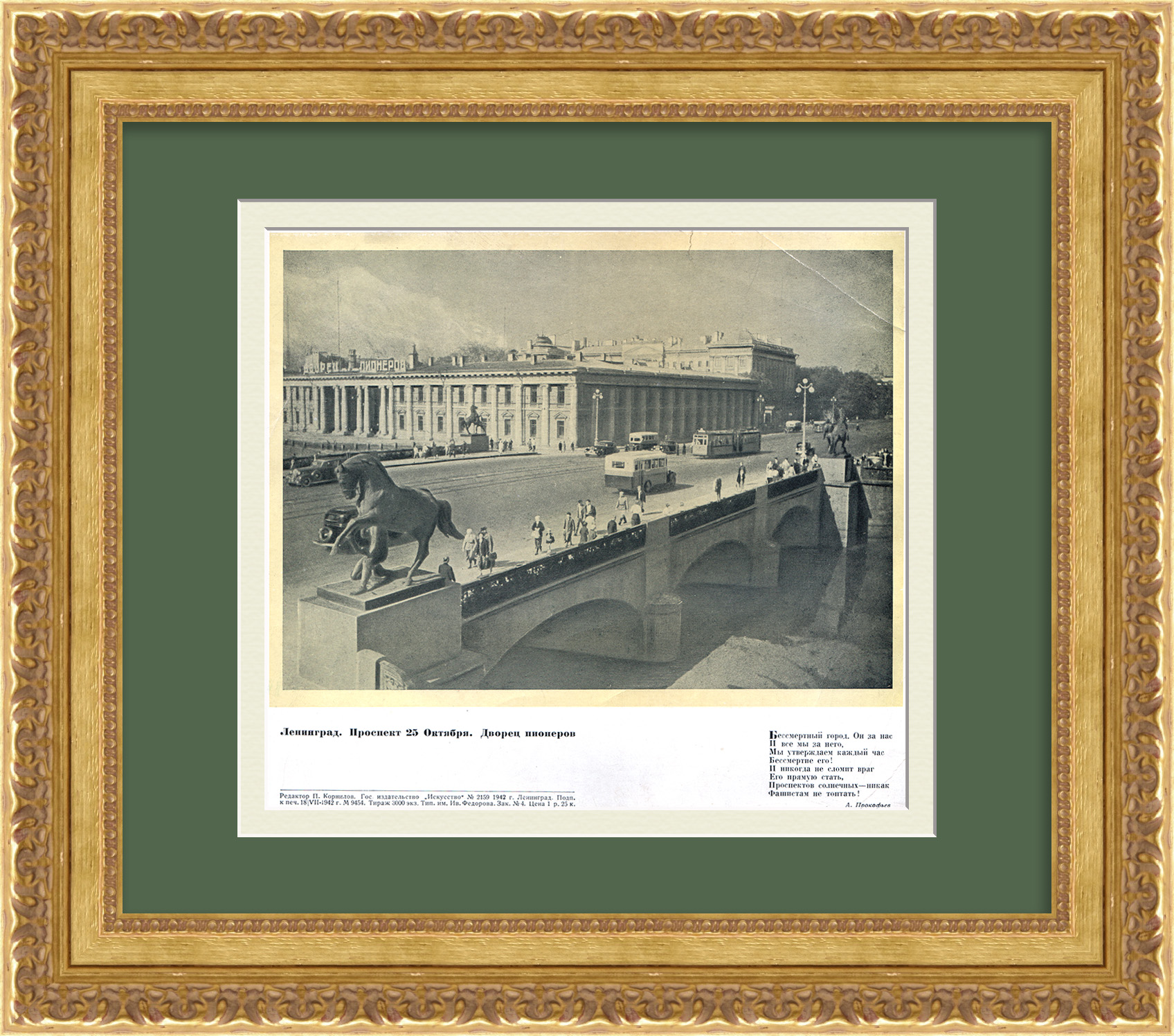 Старинная тиражная графика времен блокадного Ленинграда изображает вид на Аничков мост и Дворец пионеров на Проспекте 25 Октября (сегодня – Невский проспект). Иллюстрация была, вероятно, сделана по фотографии 1937-1940 гг. Н.Н. Штерцера – известного фотографа, чьи работы воспроизводились на открытках ленинградским отделением издательства «Искусство». Блокада Ленинграда, начавшаяся 8 сентября 1941 г., - самая продолжительная осада города за всю историю человечества длилась 900 дней и ночей. К иллюстрации, вероятно, было написано стихотворение А.А. Прокофьевым - русским советским поэтом и журналистом, военным корреспондентом в годы Великой Отечественной войны: