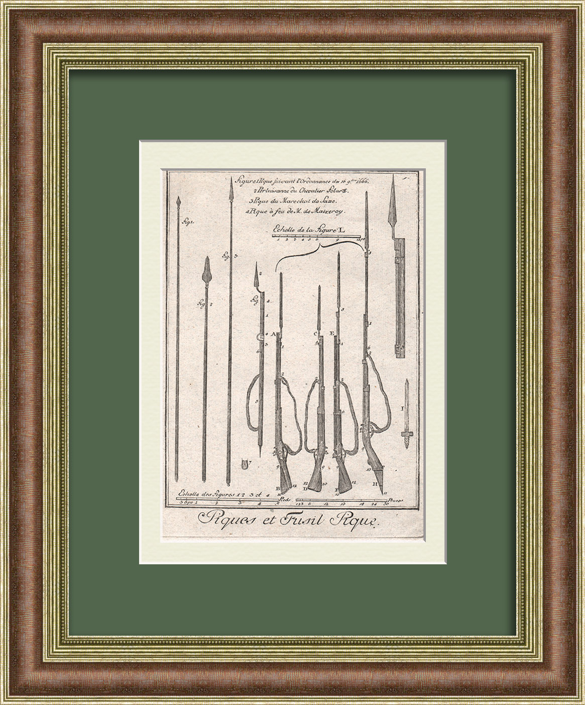 Уникальная, коллекционная гравюра на меди эпохи Просвещения с оригинальным названием «Piques et Fusil Pique» / «Пики и штыки для мушкетов» демонстрирует высокий уровень военного оснащения в то время. Эпоха Просвещения помимо подъема научной и философской мысли также характеризуется постоянным пребыванием Европы и Северной Америки в военном положении, что требовало активной, непрерывной модернизации военного оружия, тактик ведения боя. В Словаре Д. Дидро присутствуют около 1250 статей на темы производства оружия, фортификации, артиллерии, тактики и стратегии, что свидетельствует о высоком спросе на практическую информацию о военном искусстве.