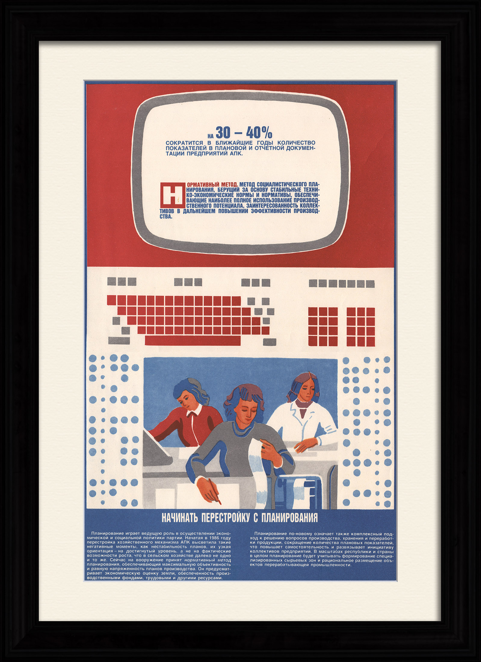 На графическом листе представлен стилизованный образ компьютера, на экране которого выведены статистические данные: «на 30-40% сократится в ближайшие годы количество показателей в плановой и отчетной документации предприятий АПК.» В нижней части плаката представлены девушки из отдела планирования, которые обрабатывают данные с помощью высокотехничных и функциональных ЭВМ. Завершает идейный замысел плаката информационный пассаж о достоинствах планирования в осуществлении экономической и социальной политике партии.