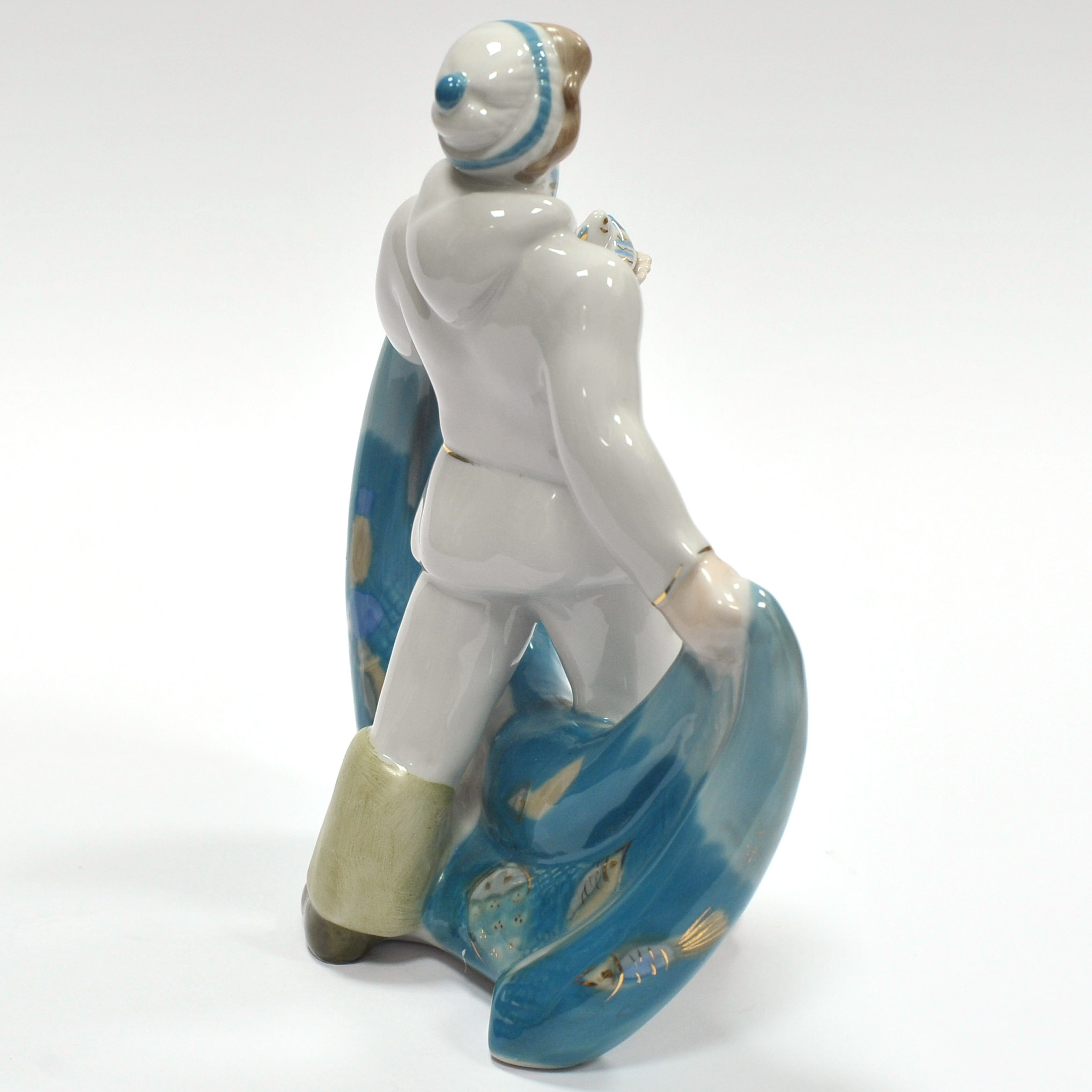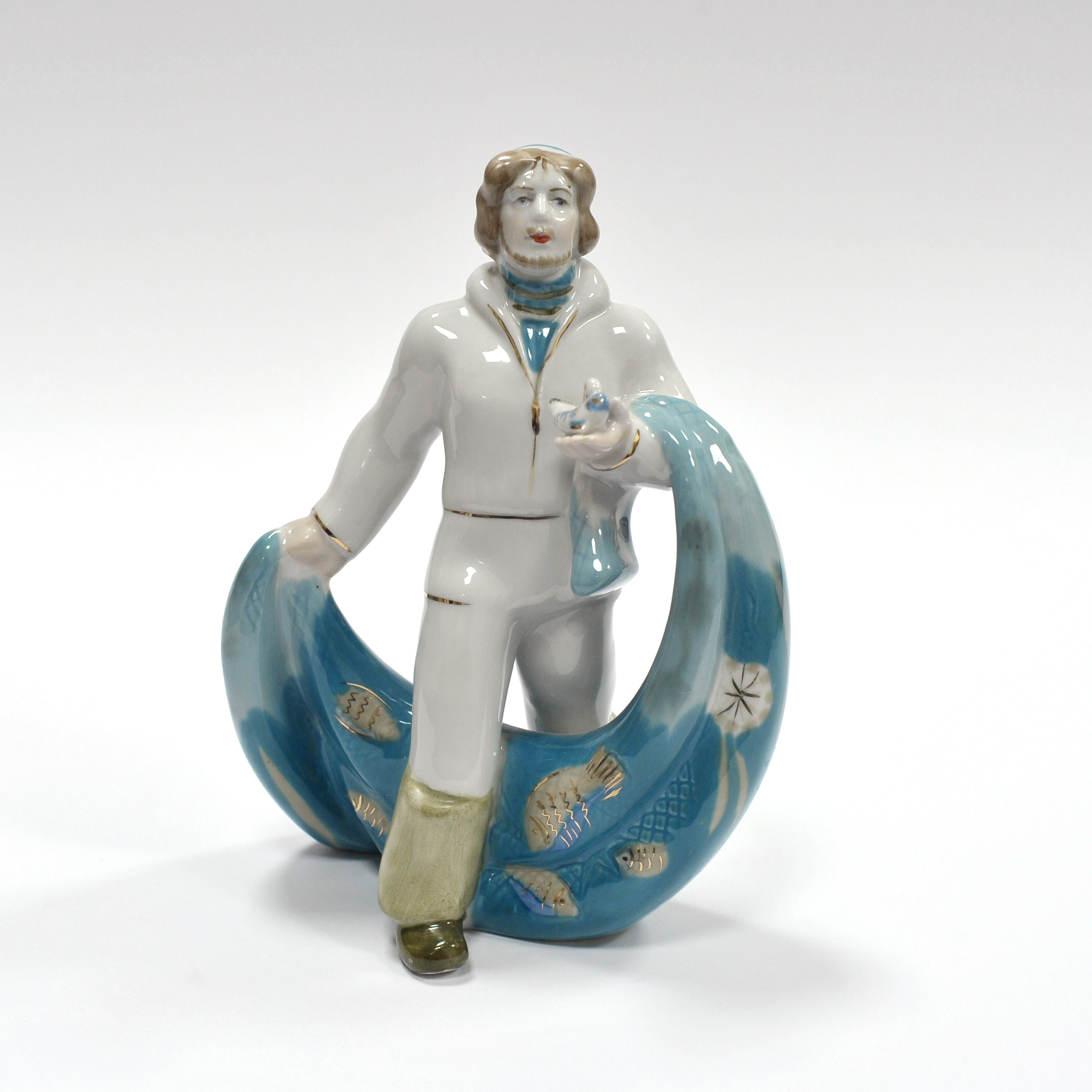 Винтажная советская фарфоровая статуэтка, произведенная на Полонском заводе художественной керамики (ЗХК Полонне) представляет собой образ рыбака, держащего сеть, полную свежепойманной рыбы. В руке он держит двух небольших рыбок. Рыболовецкая отрасль со второй половины XX в. в СССР характеризуется бурным подъемом и апогеем вылова морепродуктов. Так, в 1970 г. улов советского рыболовецкого промысла составил 7.3 млн тонн рыбы, в 1980 г. - 9.7 млн тонн рыбы, а к 1988 г. было достигнут рекордный показатель в 11.5 млн тонн рыбы. Так, к началу 1990-х гг. Советский Союз стал лидером по валовому вылову морских ресурсов.