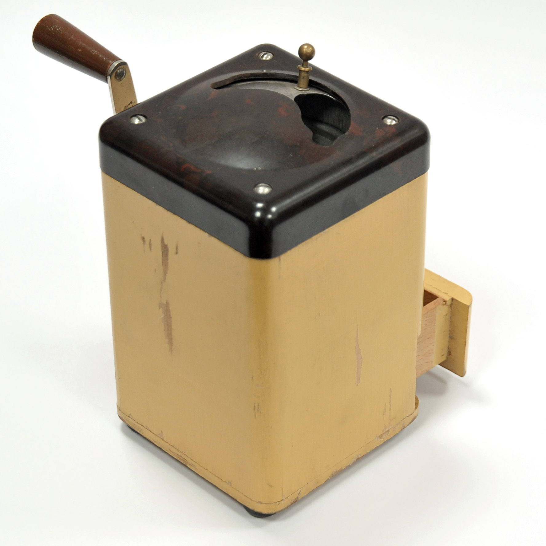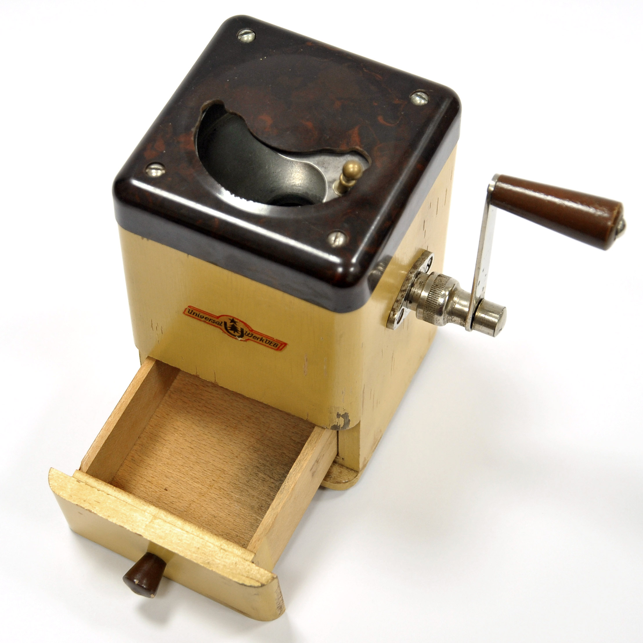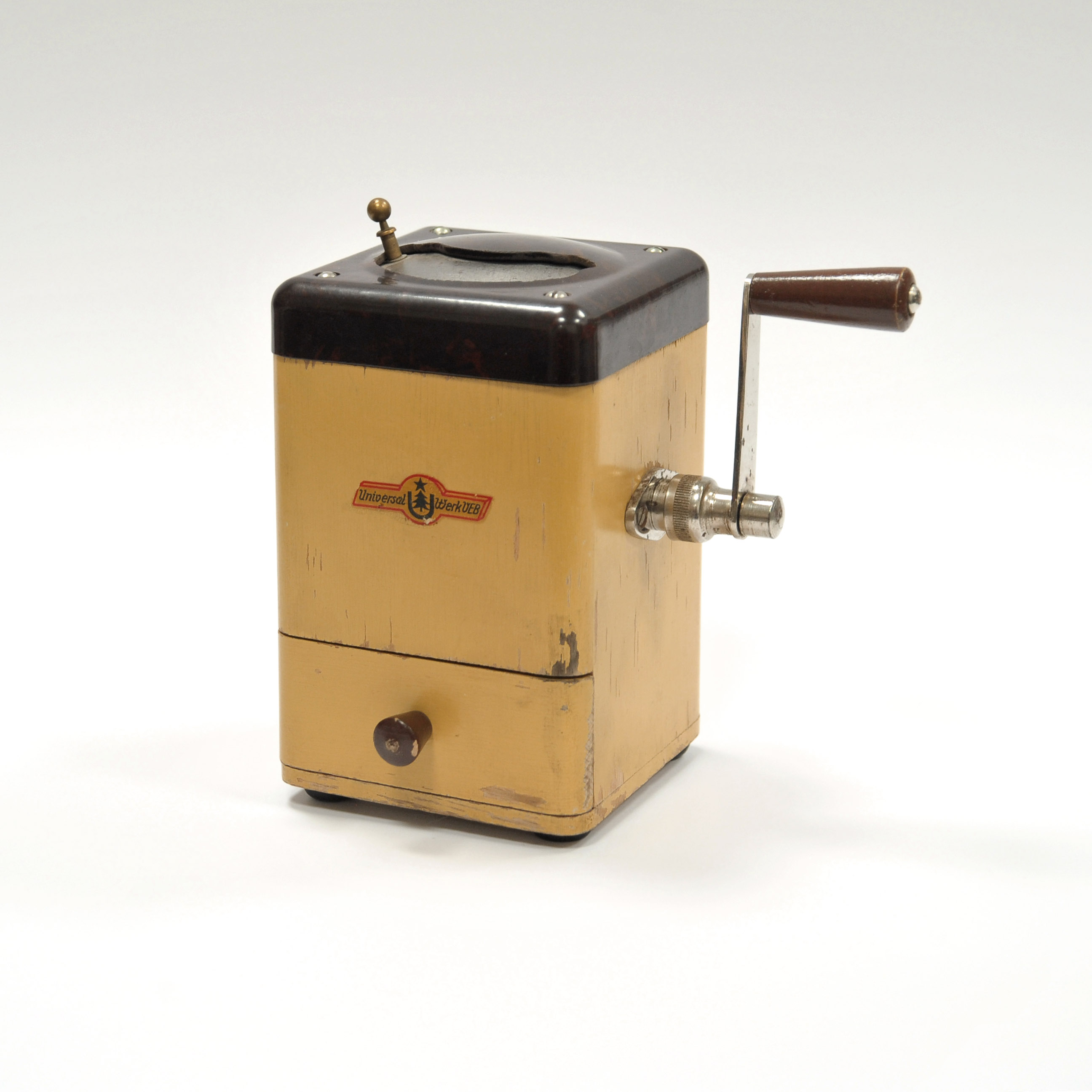 Старинная ручная настольная кофемолка относится ко второй половине XX в. Устройство для помола кофейных зерен уже не один век эволюционирует. Так, простейшие жернова появились уже в XII-XIII вв., а первая кофейная мельница была изобретена арабским механиком в XV в. В Европу популярность кофе пришла к середине XVII в. Изначально кофе был напитком аристократии, но позднее стал популярен среди простого народа. Масштабное промышленное производство ручных кофемолок наступило лишь в XIX в. В подарок к представленной кофемолке идет кофейная пара, выполненная из кедра.