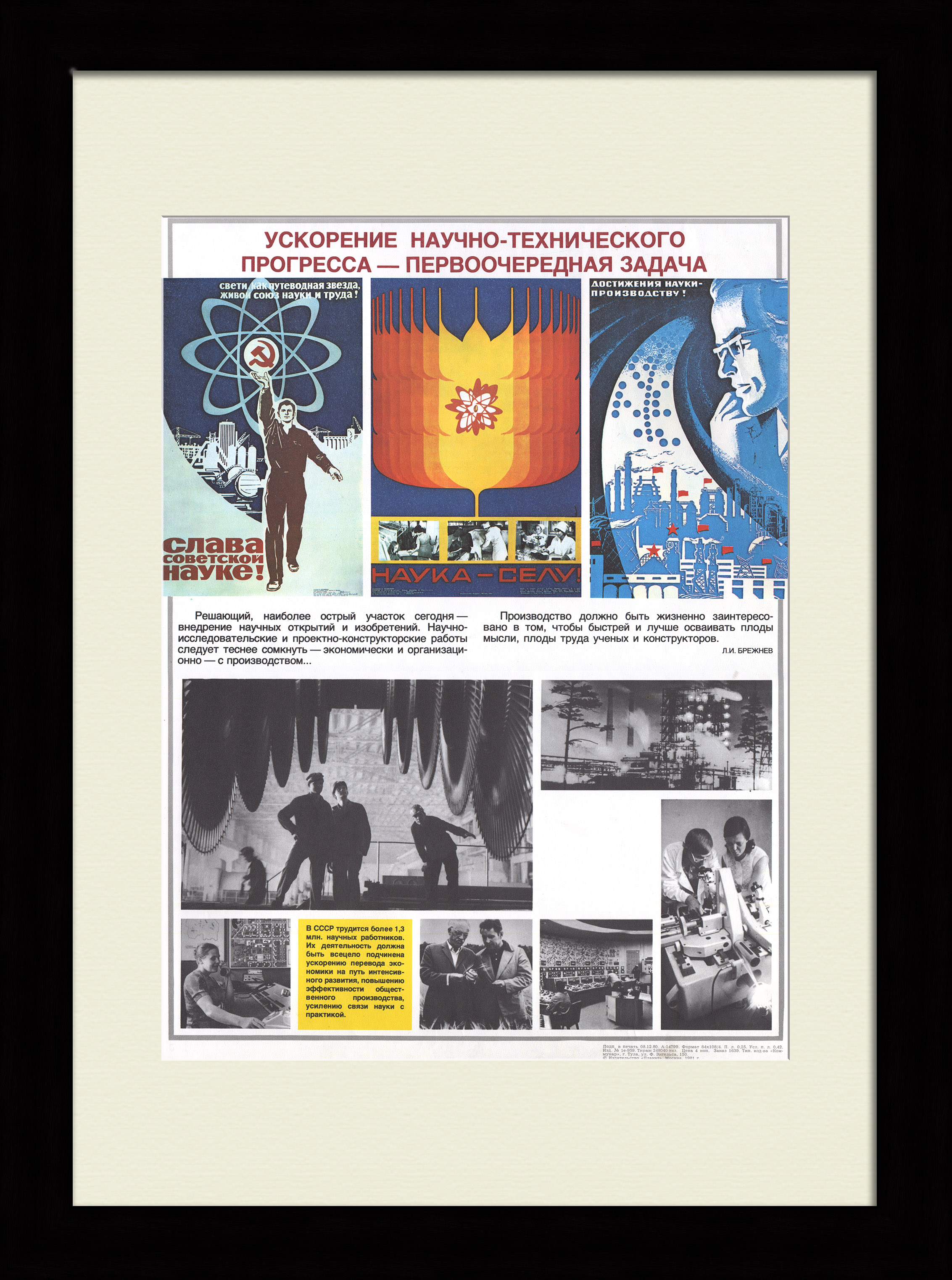 Агитационный, советский плакат времен XI пятилетки (1981-1985 гг.) посвящен стремительному развитию советской науки. На XXVI Съезде ЦК КПСС в 1981 г. было постановлено ускорить техническое перевооружение производства через внедрение новой техники и материалов на основании энерго- и материалсберегающих технологий, ускорить темпы модернизации производственных фондов в 1.5 раза: «Долг Академии Наук СССР, Государственного комитета СССР по науке и технике, всех министерств и ведомств рационально использовать выделяемые на науку средства, сконцентрировать их на приоритетных направлениях, совершенствовать координацию деятельности научных учреждений, добиваясь более быстрого результата внедрения научных исследований.». На графическом листе представлена выразительная композиция, поделенная на две части, где верхняя – примеры агитационной графики второй половины XX в., призывающая развивать и внедрять научные открытия на благо советской экономики, а нижняя часть – примеры фоторепродукций, на которых советские ученые, инженеры на деле реализуют поставленную государством задачу в лабораториях, на электростанциях, заводах, в поле. Завершает идейный замысел плаката агитационный лозунг – «Ускорение научно-технического прогресса – первоочередная задача!».