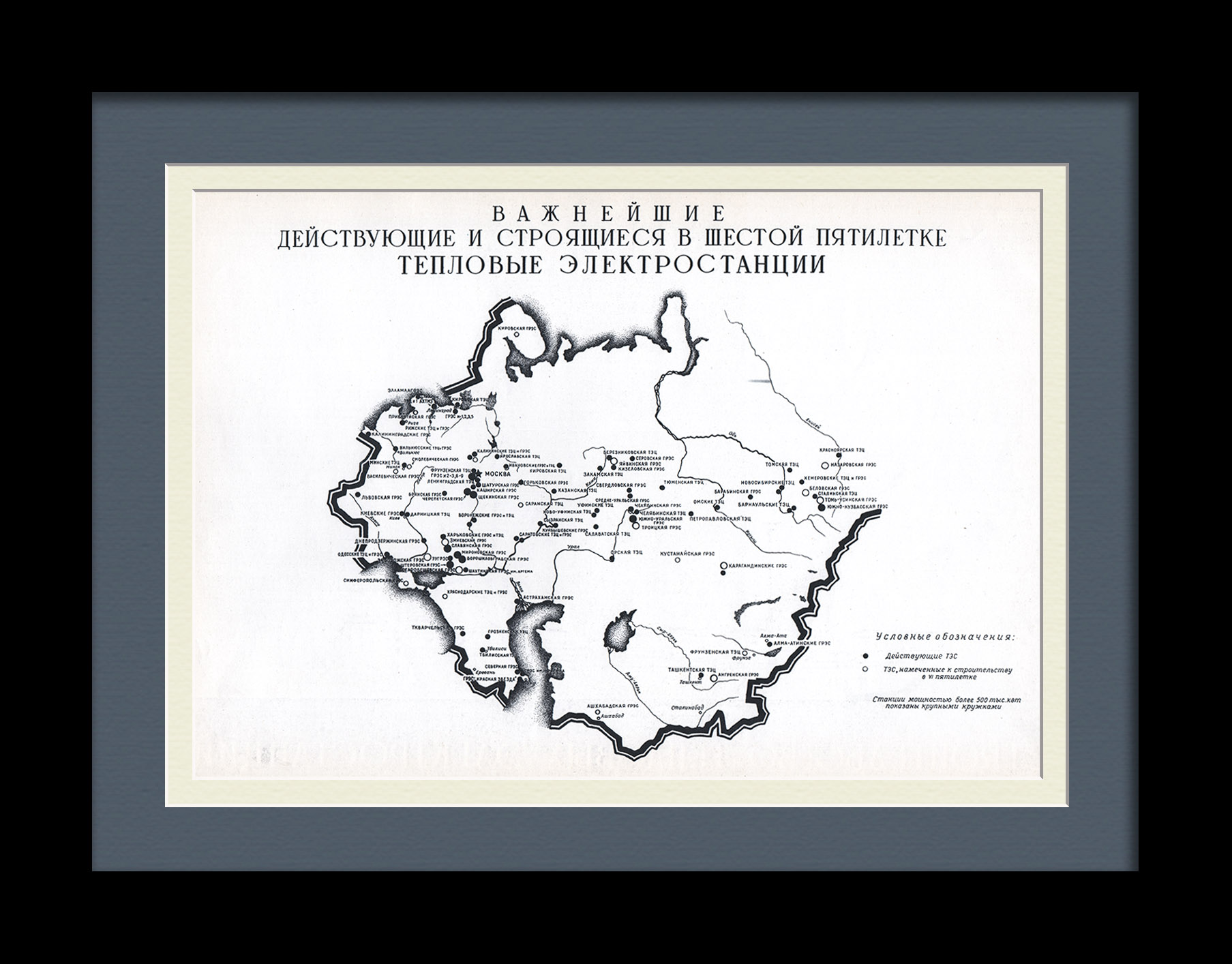 Малотиражный советский план «Важнейших действующих и строящихся в шестой пятилетке тепловых электростанций» подробным образом документирует расположение объектов энергетики в СССР. На XX Съезде ЦК КПСС в 1956 г. была подчеркнута необходимость дальнейшего наращивания мощностей на электростанциях: «Что касается строительства тепловых электростанций, то здесь ставится задача сооружения мощных электростанций с агрегатами по 100, 150 и 200 тысяч киловатт, работающего на паре высокого давления и высокой температуры.». Помимо действующих тепловых электростанций представлены 20 объектов в процессе строительства: Кировская ГРЭС, Прибалтийская ГРЭС, Смолевическая ГРЭС, Василевическая ГРЭС, Калининские ТЭЦ и ГРЭС, Змиевская ГРЭС, Запорожская ГРЭС, Старобешевская ГРЭС, Симферопольская ГРЭС, Краснодарские ТЭЦ и ГРЭС, Ашхабадская ГРЭС, Саранская ТЭЦ, Троицкая ГРЭС, Яйвинская ГРЭС, Кустанаевская ГРЭС, Карагандинские ГРЭС, Ангренская ГРЭС, Назаровская ГРЭС, Беловская ГРЭС, Томь-Усинская ГРЭС. Графический лист являлся сопровождением альбома «Энергетическое строительство СССР».