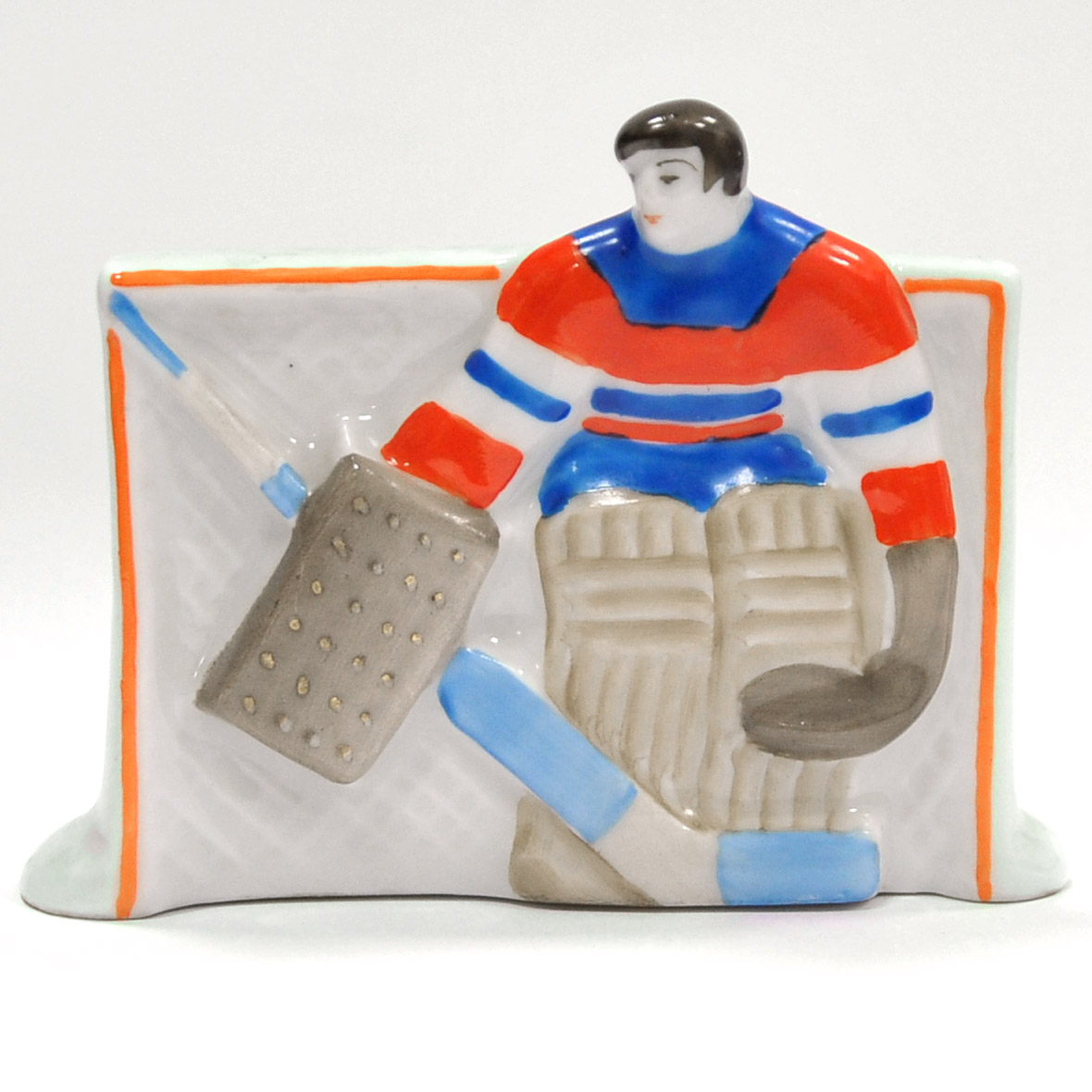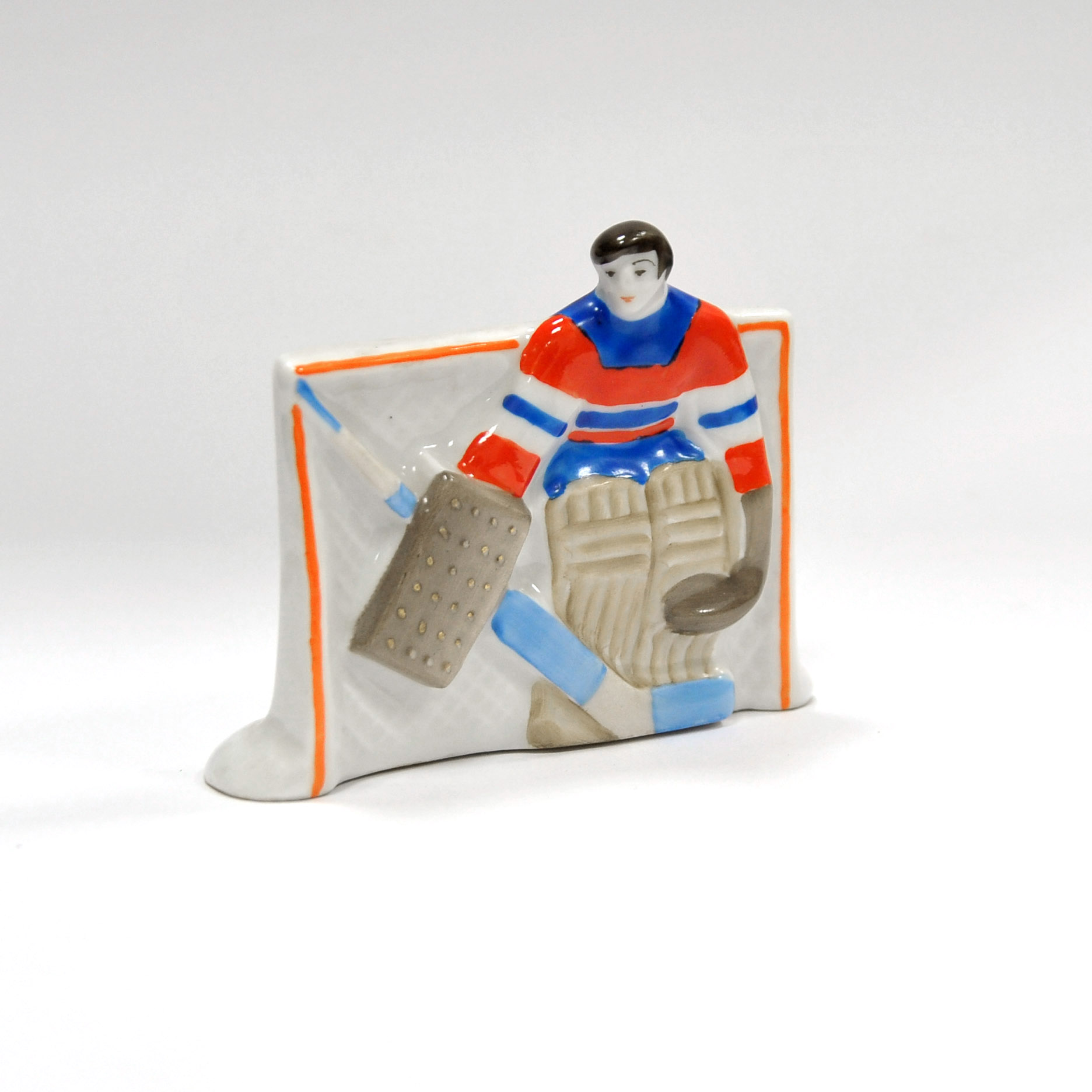 Советская винтажная фарфоровая статуэтка «Третьяк в воротах» была изготовлена на Первомайском фарфоровом заводе (с. Песочное). Скульптор создал не отдельную фигуру спортсмена, а целую композицию - вратаря, защищающего ворота. В нем воплотился образ легендарного советского хоккеиста В.А. Третьяка, игравшего за ЦСКА и сборную СССР по хоккею. На счету у него множество победных матчей, в частности, 482 игры - чемпионат СССР, 117 - Чемпионат мира и Олимпийские игры, а также 11 матчей Кубка Канады.