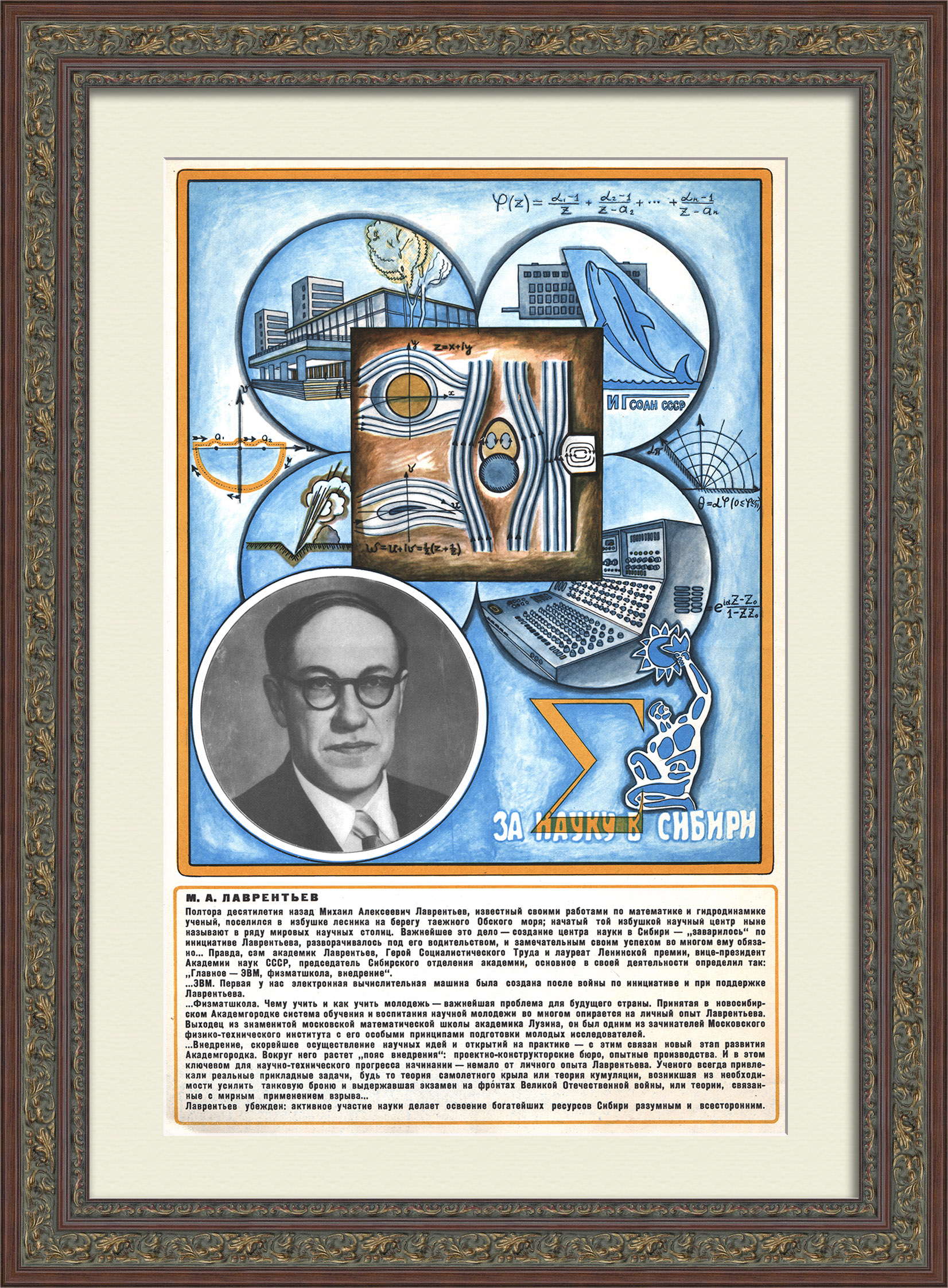 Выразительный, советский плакат посвящен одной из ключевых фигур в развитии советской науки, в частности, в Сибири, а также одному из крупнейших специалистов в области теории функций комплексного переменного, вариационного анализа и математической физики - М.А. Лаврентьеву (1900-1980) - советскому математику и механику, основателю Сибирского отделения АН СССР (СО АН СССР) и Новосибирского Академгородка, академику АН УССР (1939 г.), академику АН СССР (1946 г.) и вице-президенту (1957—1976 гг.) АН СССР. На графическом листе центральное место занимает портрет М.А. Лаврентьева в окружении ЭВМ, научных формул и образа Сибирской Академии наук. Он внес значительный вклад в развитие советского самолетостроения, являлся инициатором создания первых ЭВМ, а также получил в 1949 г. Сталинскую премию за работы в области кумуляции. Основы своей деятельности М.А. Лаврентьев определил так: «Главное - ЭВМ, физматшкола, внедрение».