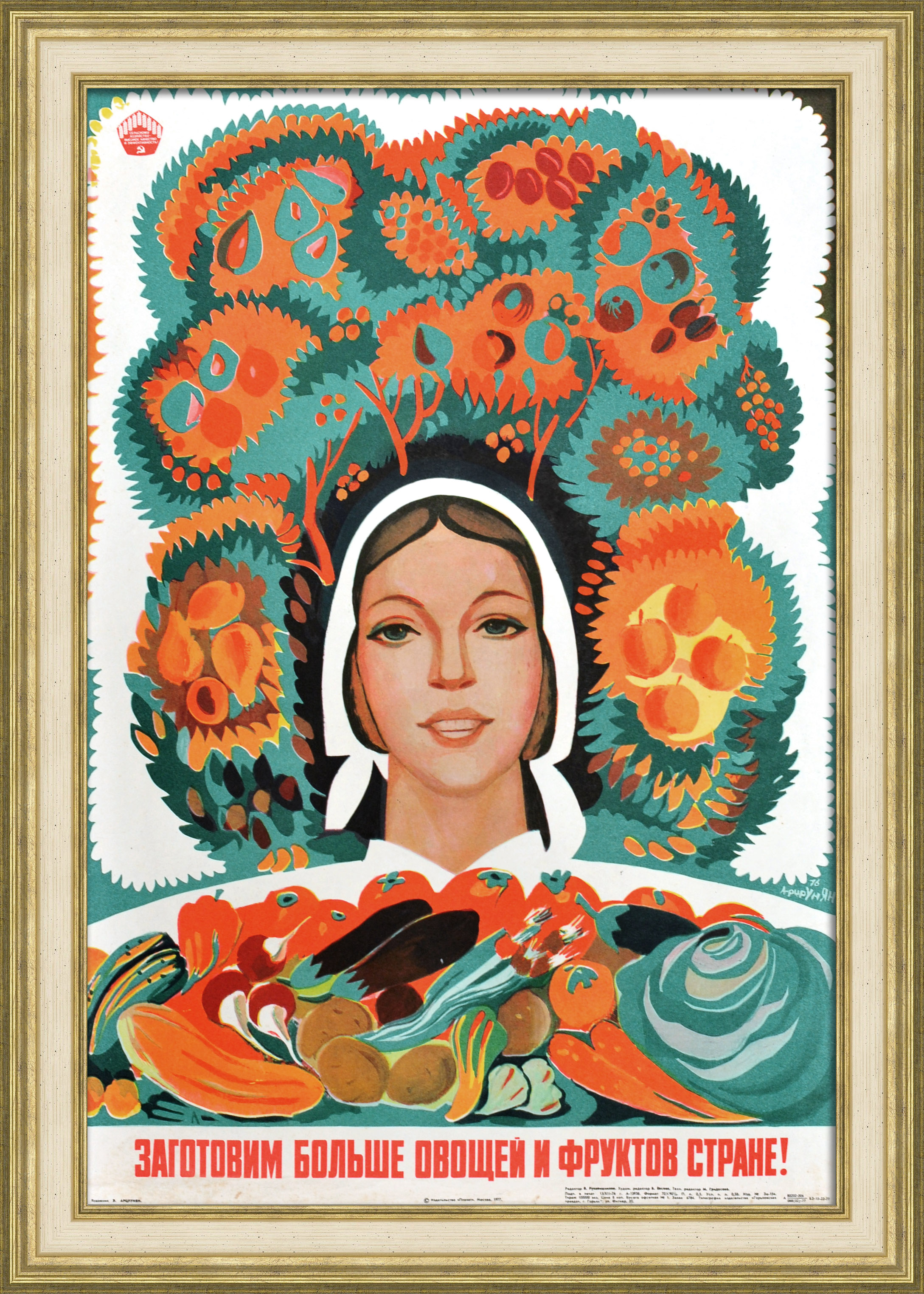 Выразительный, агитационный периода X пятилетки (1976-1980 гг.) «эффективности и качества» посвящен развитию отрасли сельского хозяйства, а именно заготовке фруктов и овощей. Так, на XXV Съезде ЦК КПСС в 1976 г. была утверждена цифра капиталовложений в сельское хозяйство в размере 172 млрд. рублей, что на 41 млрд. больше, чем в предыдущем периоде, а также выявлена необходимость увеличить поставки новой, высокопроизводительной техники, удобрений, масштабы мелиоративных работ. Все это должно было не только решить «зерновой вопрос», но и обеспечить советских граждан разнообразным продовольствием: «Выделяя задачу увеличения производства зерна, мы в то же время не можем ослаблять внимания и к другим сельскохозяйственным культурам. Значительного роста надо добиться в производстве сахарной свеклы, хлопка, овощей, фруктов. Здесь нет «мелочей» — лук нельзя заменить картофелем, а растительное масло томатным соком; на столе советского человека должно быть все. И обеспечить это — прямой долг работников сельского хозяйства.». Композиция графического листа в полной мере транслирует идею «рога изобилия» в советском сельском хозяйстве. Центральное место занимает собирательный образ работницы аграрной сферы, которая, словно обращаясь к зрителю, протягивает ему блюда со свежими, спелыми овощами и фруктами. За ее спиной возвышаются деревья, на которых растут новые плоды, что также символизирует процветание, благополучие и изобилие. Завершает идейный замысел плаката агитационный лозунг: «Заготовим больше овощей и фруктов стране!».